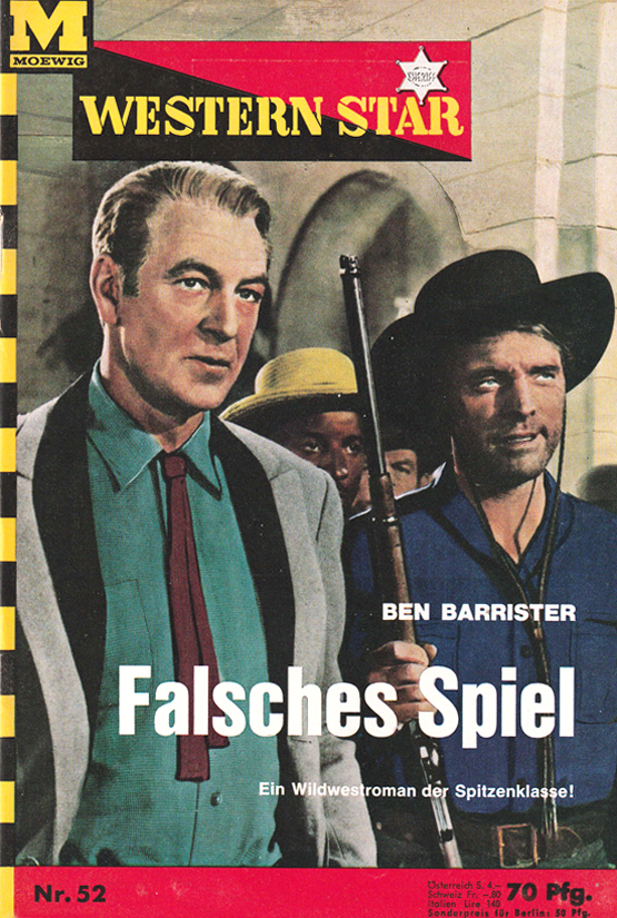 Der Autor Hasso Plötze war dafür bekannt, seine Romane möglichst oft zu wiederzuverwerten. So auch bei seiner 34-bändigen Leihbuch-Serie TOM FOX. Dafür ähnderte er gerne die Namen der Chraktere. So landeten auch fünf seiner ehemaligen TOM FOX Leihbücher hier im WESTERN STAR (05, 52, 55, 69, 107). In zwei Fällen “versteckte” er sich unter dem Tarn-Namen Ben Barrister, den er auch manchmal bei anderen LB-Nachdrucken benutzte.