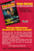 Der erste PETER MATTEK Roman erschien 1989 als Taschenbuch (Nr. 19543) im Bastei Verlag – sozusagen als Pilotfolge zur Heftserie. Der Plot erinnert an den erfolgreichen deutschen TV-Knüller PETER STROHM (1989-1996), der im selben Zeitraum erstmals ausgestrahlt wurde. Schauspieler Klaus Löwitsch spielte darin in fünf Staffeln (63 Episoden) einen Sonder-Ermittler gegen das organisierte Verbrechen.