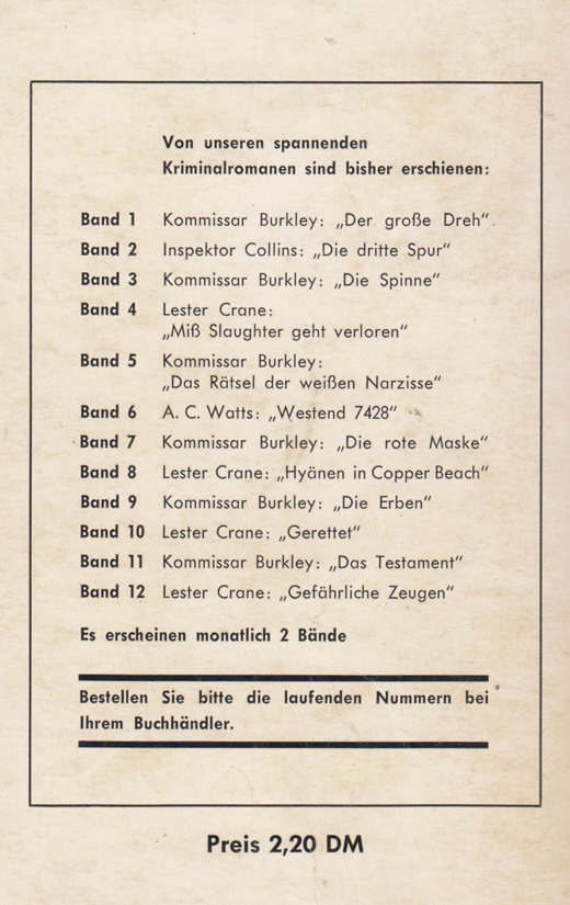 | Gefährliche Zeugen | Lester Crane | Theodor Horschelt | 1964 | EA | Band 4 | |